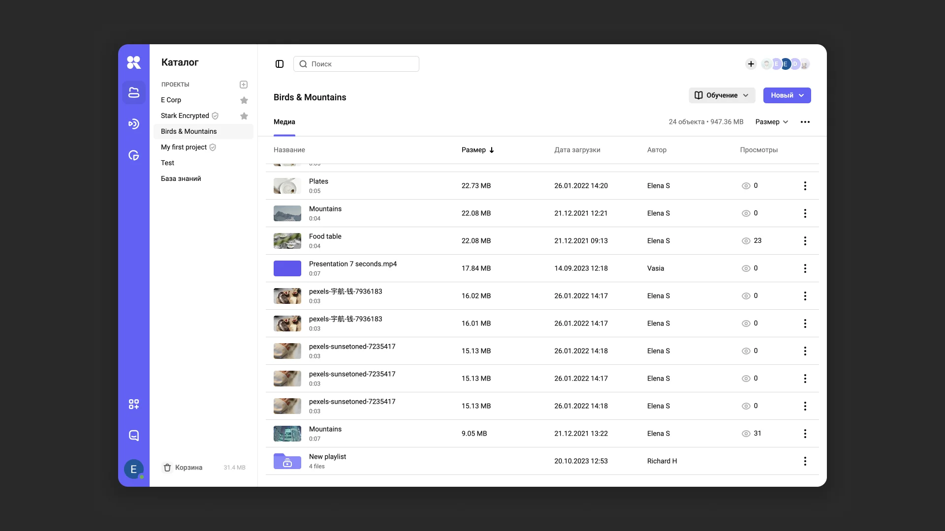 Каталог — это пространство для организации видео, где можно сгруппировать контент по проектам, папкам и тегам. Его интерфейс похож на привычную файловую систему, поэтому им легко управлять и находить нужное.